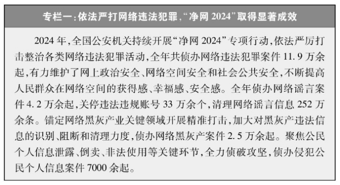 建设平安中国。持续深化严打暴恐专项行动,对“东突”等“三股势力”保持依法严打高压态势,实现反恐斗争形势根本好转。依法打击各类黑恶势力违法犯罪,扫黑除恶常态化走深走实。社会治安持续稳定向好,依法严惩群众反映强烈的黄赌毒、食药环、盗抢骗和针对妇女儿童、留守老人的突出违法犯罪,依法严厉打击电信网络诈骗、跨境赌博、侵犯公民个人信息等新型犯罪和跨国跨境跨区域犯罪,保护人民人身权、财产权、人格权。建立健全维护社会稳定责任制,社会大局保持稳定。坚持和发展新时代“枫桥经验”,加强综治中心规范化建设,推进矛盾纠纷化解法治化。维护社会公平正义,培育自尊自信、理性平和、积极向上的社会心态。中国是世界上命案发案率最低、刑事犯罪率最低、枪爆案件最少的国家之一。据中国公安部数据,2023年中国每十万人命案发生数为0.46起,2024年为0.44起。