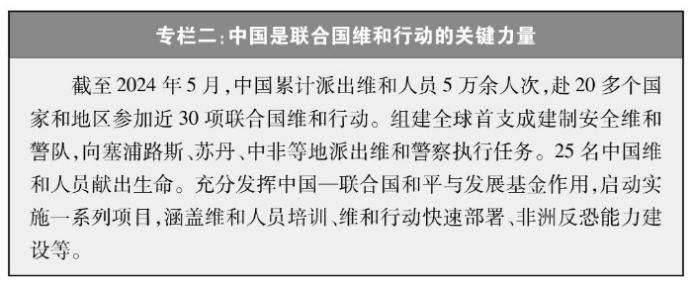 坚定支持联合国提高维和行动履行授权能力。中国是联合国第二大会费国、第二大维和摊款国,也是安理会常任理事国第一大维和行动出兵出警国。支持联合国在国际反恐斗争中发挥中心协调作用,在全球数字治理和规则制定方面发挥主导作用,支持世卫组织在全球卫生事务中发挥领导协调作用,支持联合国教科文组织推动全球教育、科技、文化发展,促进文明交流互鉴、包容合作。