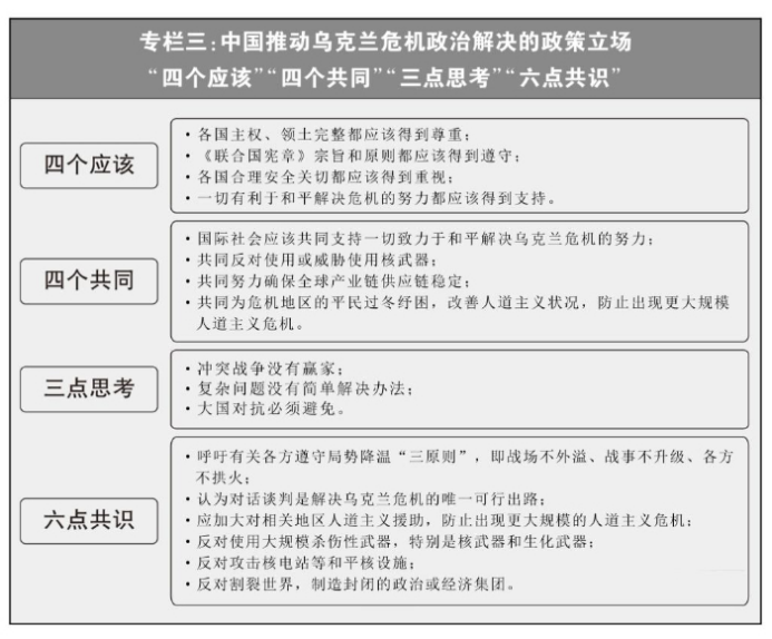在乌克兰问题上,恪守客观公正,积极劝和促谈,提出“四个应该”、“四个共同”、“三点思考”,发布《关于政治解决乌克兰危机的中国立场》,同巴西联合发布“六点共识”,会同“全球南方”国家发起“和平之友”小组,坚决维护“核战争打不赢也打不得”共识,积极推动落实《五个核武器国家领导人关于防止核战争与避免军备竞赛的联合声明》,为防止乌克兰危机升级为核冲突发挥重要作用。中方支持一切致力于和平的努力,同时认为所有当事方和利益攸关方都应适时参与到和谈进程中。